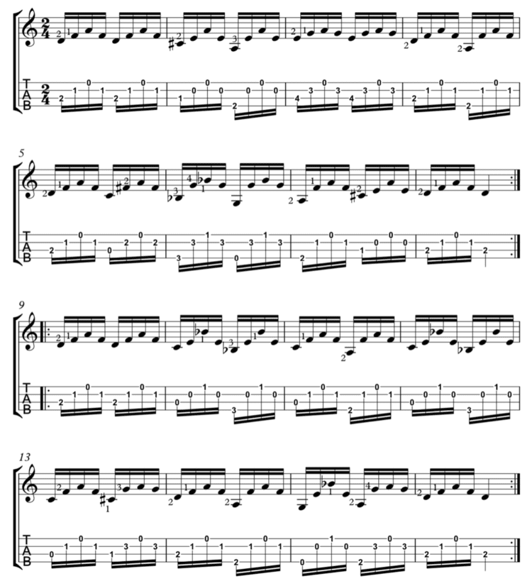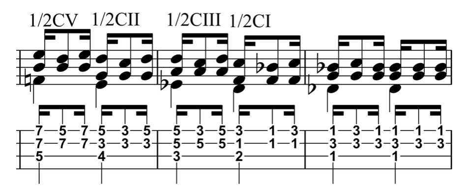 and 1st strings to create stepwise motion that can overlap in each position for sustain.
