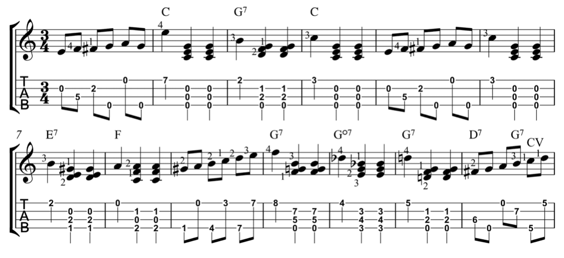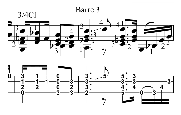 Many techniques that are common on the ukulele can be used to interpret pieces from the classical guitar repertoire. One technique is creating barre chords with the second, third, or fourth fingers. Here is an example of a third finger barre chord in Choros No.1 by Heitor Villa Lobos:
