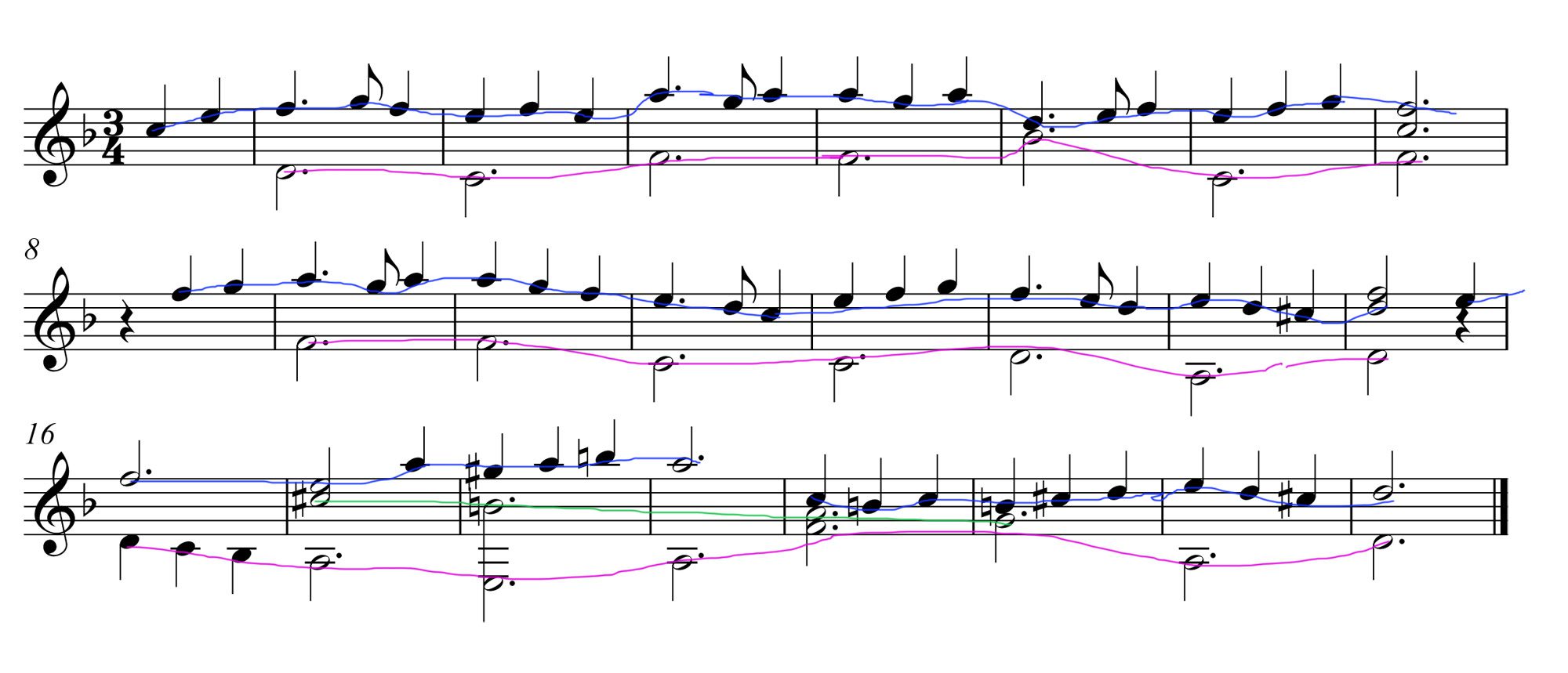 Now, if we take the same passage of music, and consider the phrases to overlap one another, or to ‘elide’, then we get a somewhat different shaping of the music. In this case, the D and C lead back in to the next complimenting phrase and it give an almost up-beat effect. Both phrasings are ‘correct’ but they have different outcomes. And therein we find the wonderful world of phrasing and its possibilities. Just like the meanings of spoken sentences can be changed by commas, so can musical phrases have variation in meaning and cohesion.