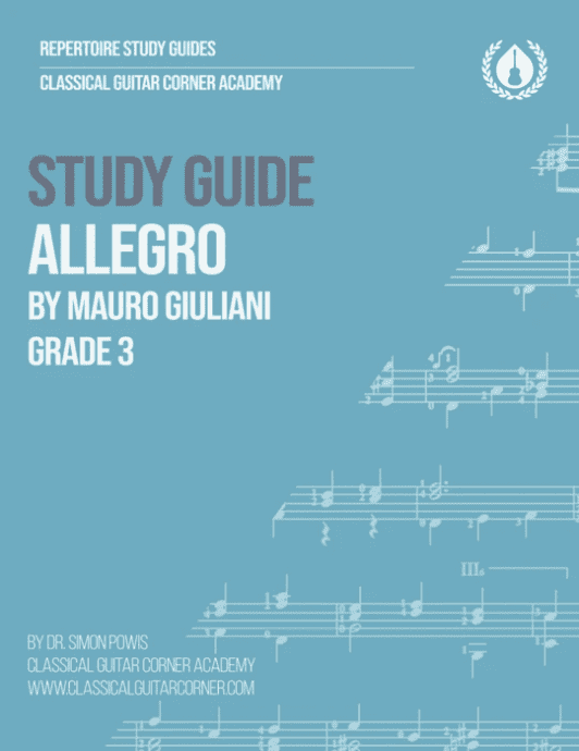 The Study Guide for Mauro Giuliani‘s Allegro contains all of the examples and exercises to go along with the video. Starting with the full score, it provides a series of exercises and practice aids to help you learn the piece. It is just like having a one on one lesson!
