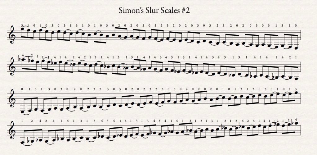 Focus on making a clean, crisp slur with a consistent snapping motion. After a while you will find that these scales start to flow nicely, at that point go and impress your girlfriend/boyfriend/attentive pet with your snappy slurry scales.